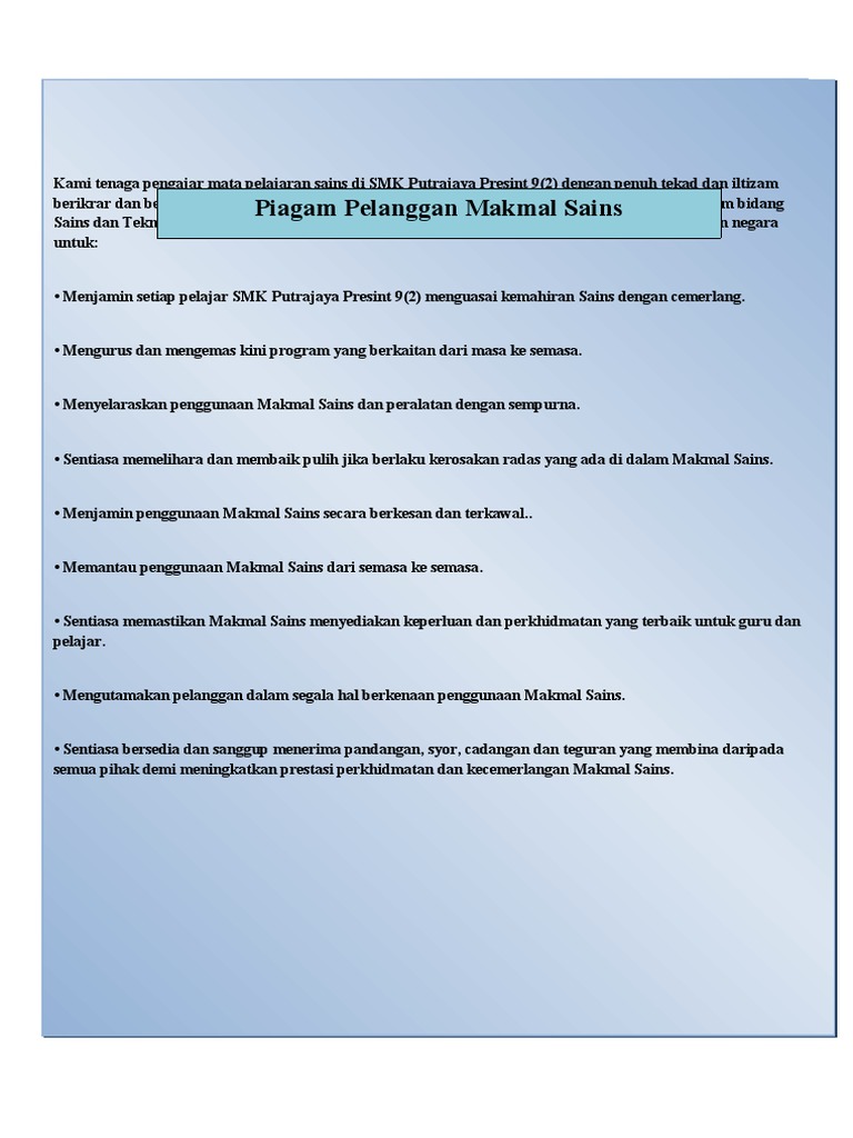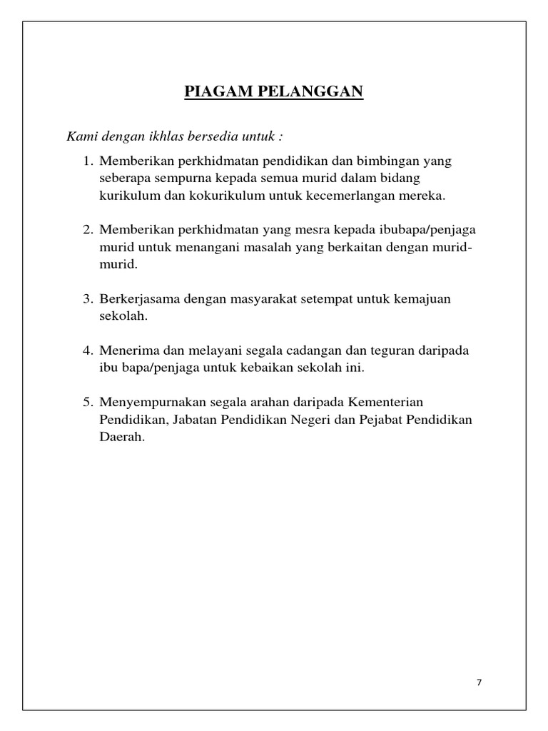 Mereka perlu diberi perkhidma tan yang berkualiti. Mengumumkan keputusan permohonan kemasukan pelajar dalam tempoh 30 hari bekerja sebelum pendaftaran pelajar baharu ke universiti awam,politeknik,kolej komuniti dan ilka. Translation memories are created by human, but computer aligned, which might cause mistakes. Jabatan hendaklah memberi perkhidmatan yang cekap, tepat, s elamat, menepati masa. Memberi perkhidmatan yang cekap, mesra, adil dan saksama. To plan the development of the capital in an efficient, organised, controlled and transparent manner to make the city grow and remain competitive through the approval of development orders, building plans and earthworks within the prescribed period from the date of receipt of complete application. Mohd akmal bin abdul manab. By jpn_marlia client charter, client's charter division of identity card division, information, piagam pelanggan, piagam pelanggan bahagian kad pengenalan comments off. Selama lebih 70 tahun, aia telah membantu pelanggannya di malaysia merancang, melindungi dan membuat persediaan untuk piagam pelanggan menggariskan piawaian perkhidmatan kami untuk memenuhi segala keperluan pelanggan aia bhd., aia public. Pemegang piagam pemegang piagam pemegang piagam pen pengarah kanan languages. Kami berjanji dan komited untuk menyediakan perkhidmatan yang cekap, profesional, beretika dan mesra kepada pelanggan kami seperti berikut Owner, canada, charter, customer, benefits, standards, onboarding. Menyediakan latihan untuk meningkatkan kualiti dan produktiviti sumber manusia dalam industri.