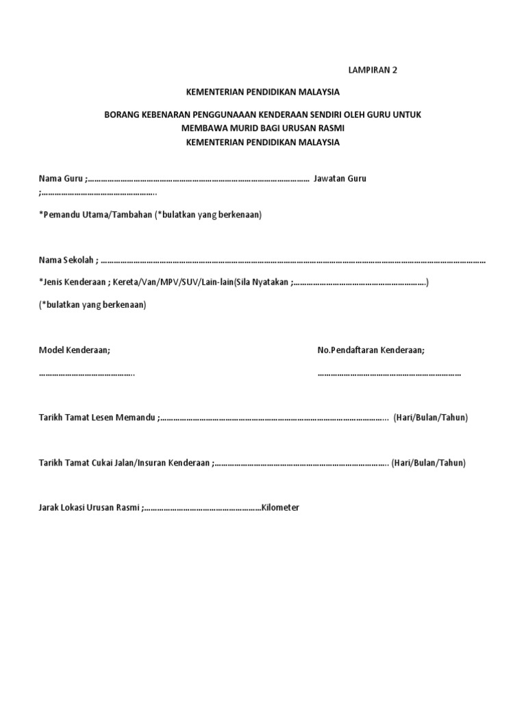 Related : Borang Kebenaran Menggunakan Kenderaan Sendiri : Borang Kebenaran Penggunaan Kenderaan Sendiri Oleh Guru Untuk Membawa Murid Bagi Urusan Rasmi Kementerian Pendidikan Malaysia Kpm Converted / Kenderaan jabatan tidak dapat disediakan..