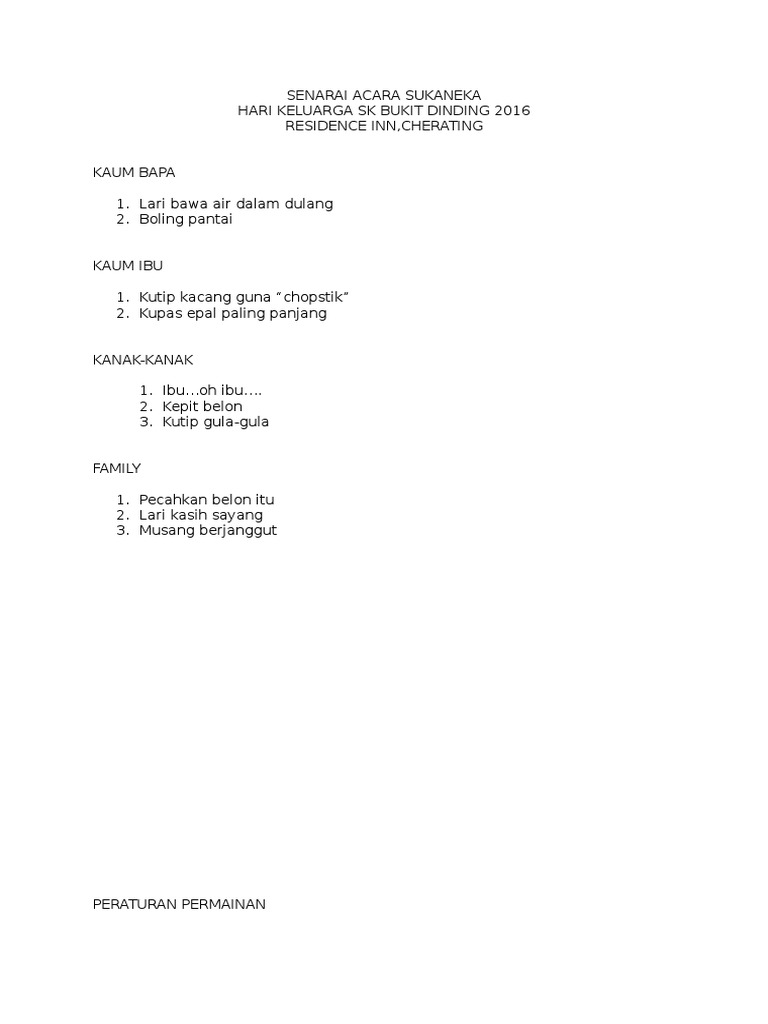 For more information and source, see on this link : Senarai acara sukaneka hari keluarga. Family day contoh senarai acara sukaneka. Hari keluarga contoh senarai acara sukaneka. For more information and source, see on this link : Kertas kerja penganjuran karnival sukan rakyat 2011 fbru. For more information and source, see on this link : Contoh kertas kerja projek pertanian pdf contoh laporan kewangan program universiti contoh minit mesyuarat jabatan perkhidmatan awam. Ada juga saya selitkan permainan tambahan yang saya pernah lihat sebelum ini yang dijalankan di sekolah, atau pun di tempat lain. Hari keluarga contoh senarai acara sukaneka. More images for contoh senarai acara sukaneka » For more information and source, see on this link : Family day contoh senarai acara sukaneka.
