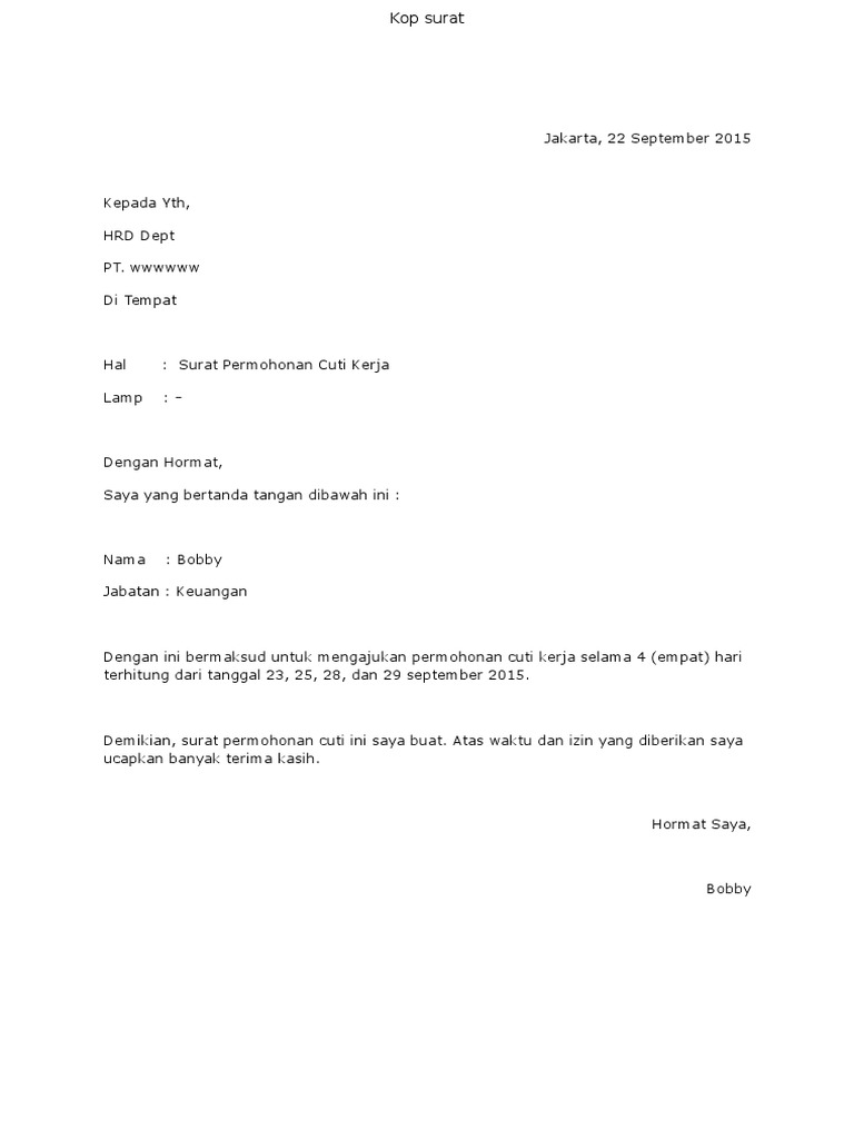Surat Permohonan Cuti Kerja / contoh surat memohon cuti sekolah : Contoh surat permohonan cuti haji.. Karena surat cuti ini harus langsung diberikan sebelum mereka memasuki masa melahirkan. 8 contoh surat cuti berbagai macam kegunaan sesuai keperluan. Simpan surat mohon cuti untuk nanti. Contoh surat cuti kerja dari majikan have a graphic associated with the other.contoh surat cuti kerja dari majikan it also will include a picture of a sort that may be observed in the gallery. 27% menganggap dokumen ini tidak bermanfaat, tandai dokumen ini sebagai tidak bermanfaat.